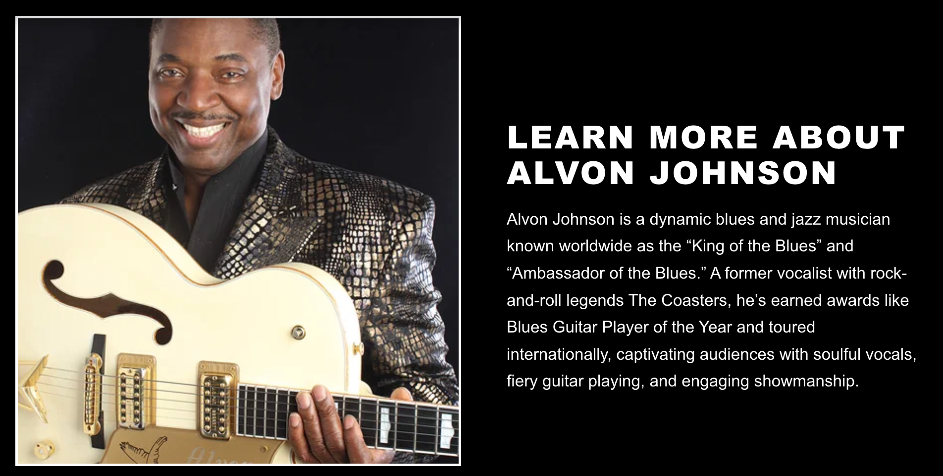 Alvon Johnson is an award-winning blues singer, guitarist, and former lead vocalist of the legendary Rock & Roll Hall of Fame group The Coasters. Known for his soulful voice, masterful guitar work, and electrifying stage presence, Johnson blends classic blues, R&B, and roots music into unforgettable live performances. A dynamic entertainer with international acclaim, he brings passion, authenticity, and decades of experience to every stage he steps on.
