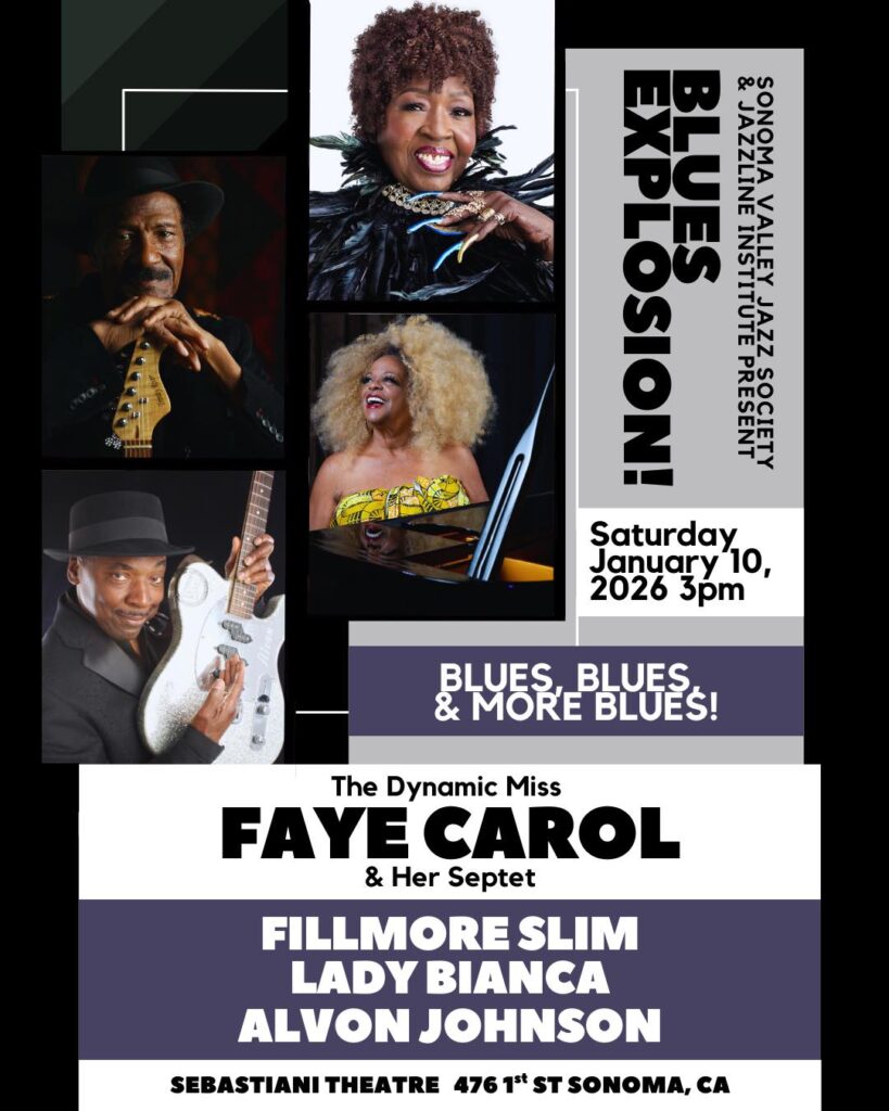 Sonoma Valley Jazz Society and the Sebastiani Theatre in partnership with JaZzLine INSTITUTE present Blues Explosion, a powerhouse lineup featuring four of the finest blues artists from the Bay Area and beyond. The Dynamic Miss Faye Carol, Fillmore Slim, Lady Bianca, and Alvon Johnson